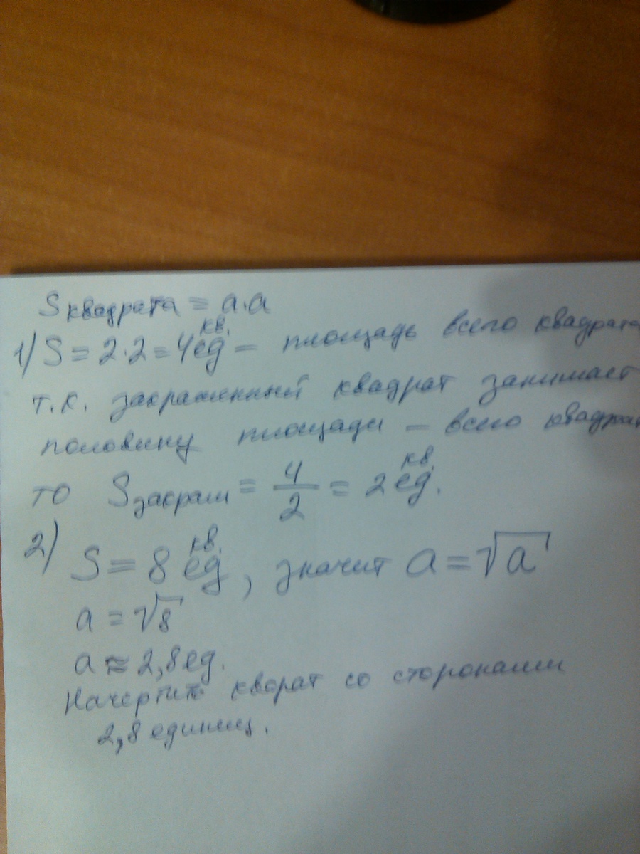 На рисунке 7.31 закрашенная часть квадрата тоже квадрат. Найдите его площадь. Начертите квадрат, площадь которого ровна 8 квадратным единицам.