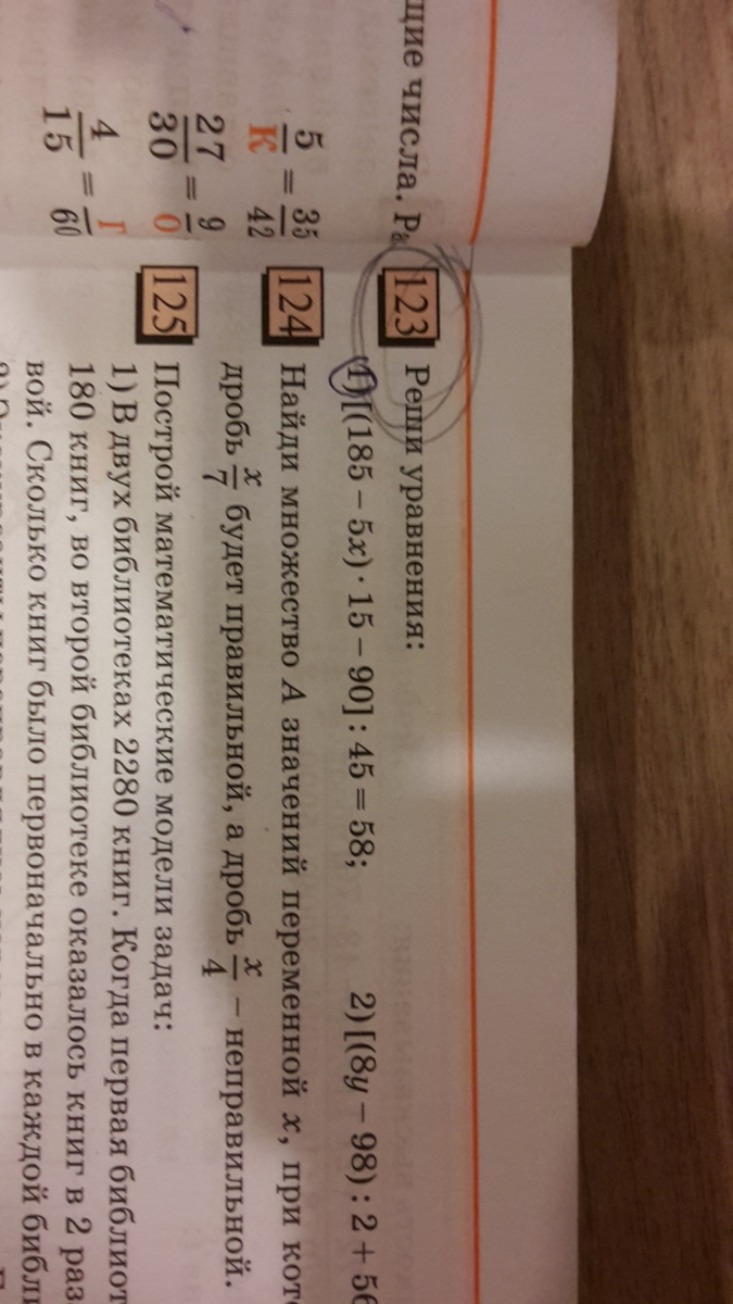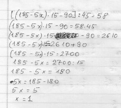 ((185- 5х)* 15-90) : 45 = 58(185*15 - 90 - 75х):45 = 58185/3 - 2 - 5/3х = 58 (умножаем на 3 обе части )185 - 6 - 5 х = 1745-5х = 0х = 1