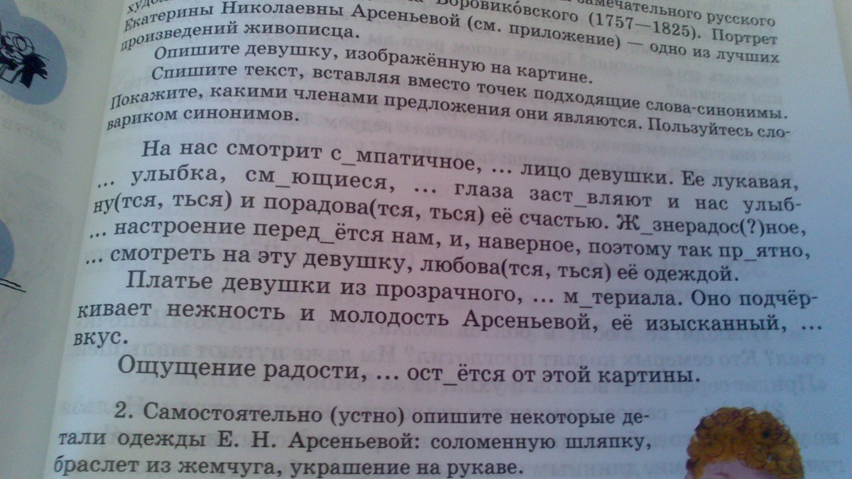На нас смотрит симпатичное, очарованное лицо девушки. Её лукавая, игривая улыбка, смеющиеся, озорные глаза заставляют и нас улыбнуться и порадоваться её счастью. Жизнерадостное, веселое настроение передается нам, и, наверное, поэтому так приятно, удивленно смотреть на эту девушку, любоваться её одеждой.