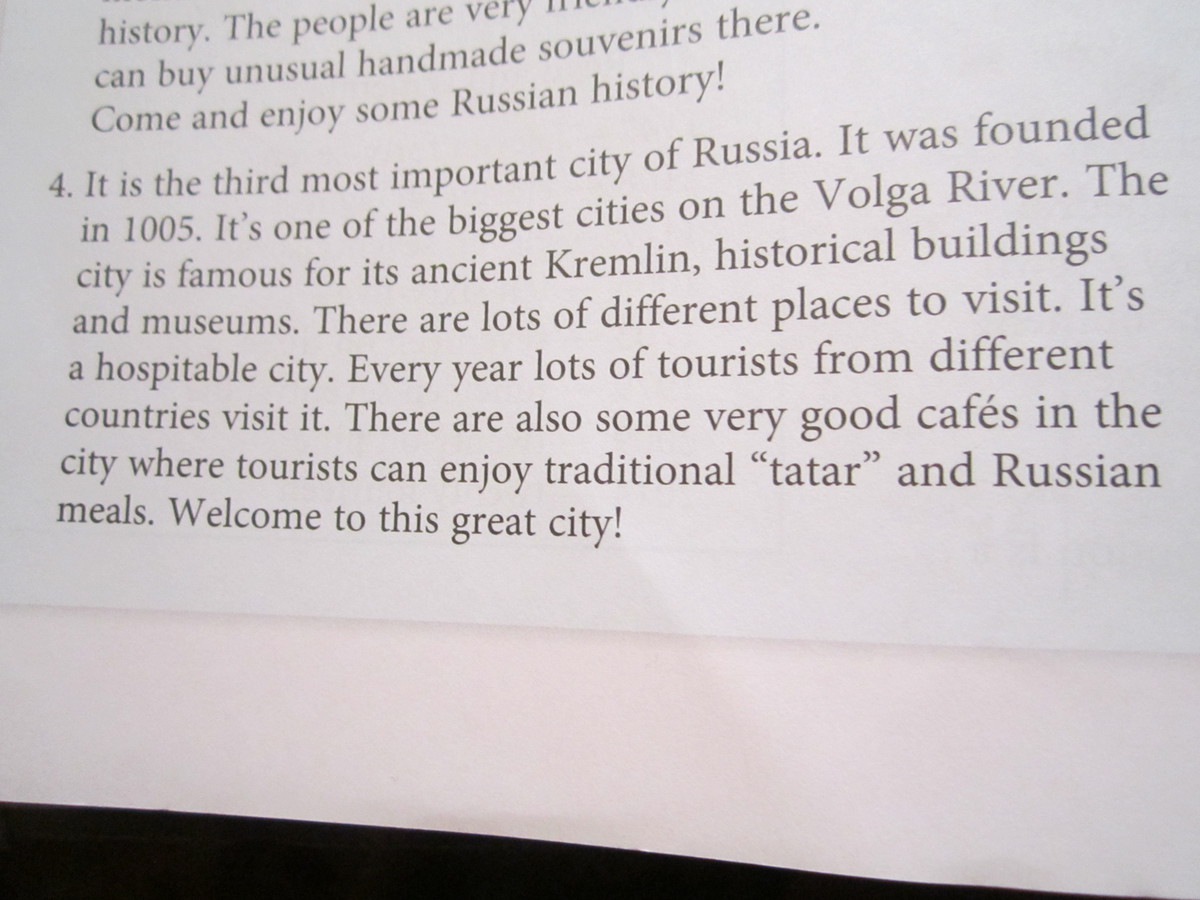 Это третий самый важный город России. Он был основан в 1005 году. Это один из самых больших городов на Волге. город славится своими древним Кремлем, исторических зданий и музеев. есть много разных стран посетить его. есть также некоторые очень хорошие рестораны в городе, где туристы могут насладиться традиционной татарской и русской кухней. Добро пожаловать в Этот великий город