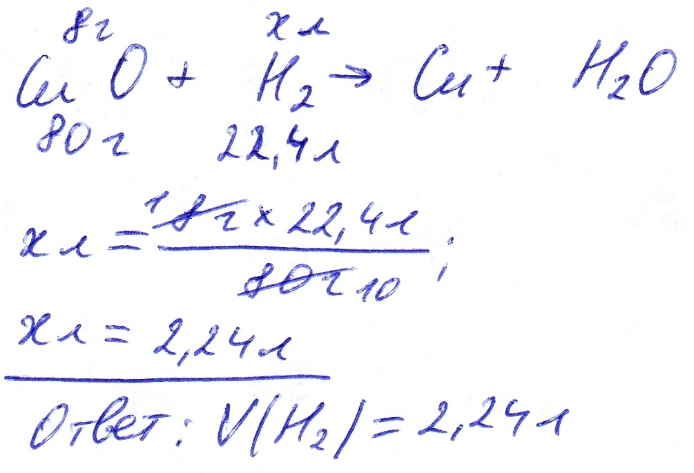 Какой обьём водорода при н.у. потребуется для восстановления меди из оксида меди (II) массой 8 г?