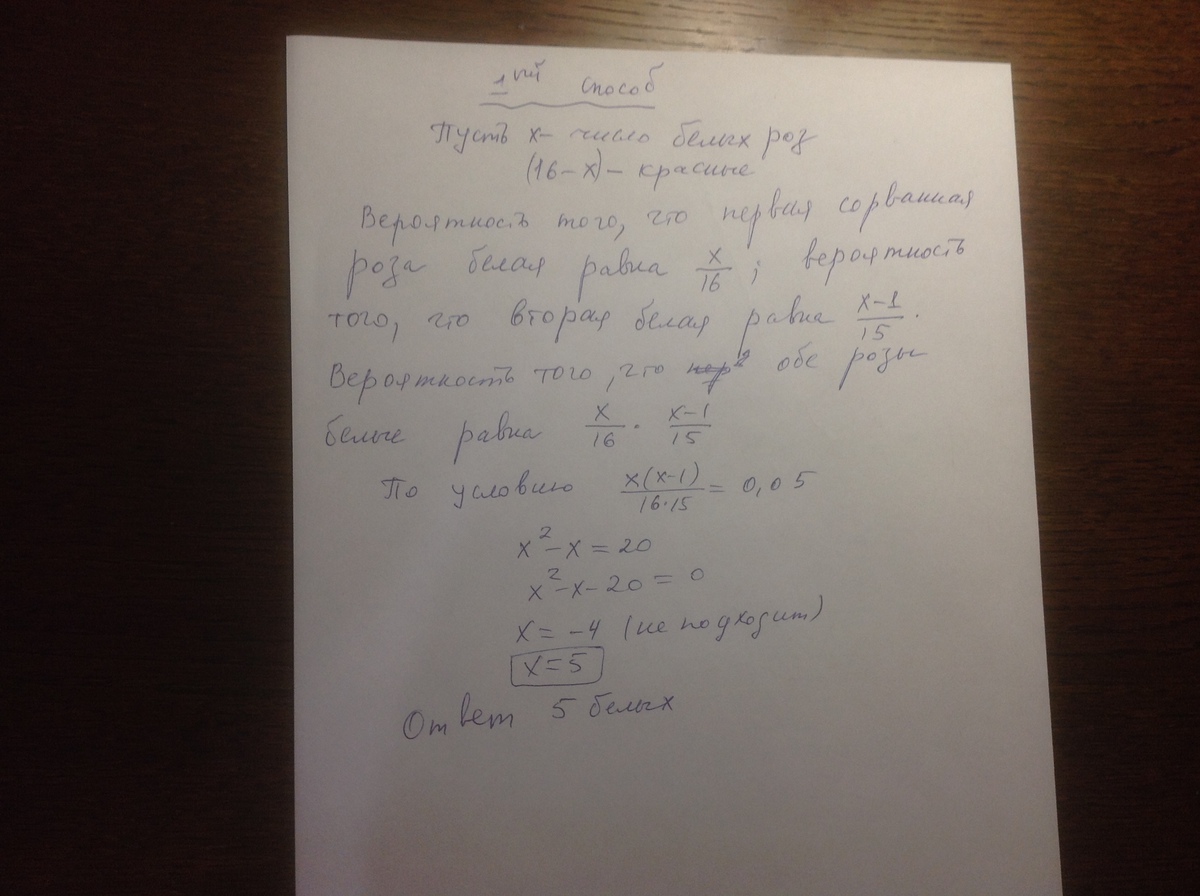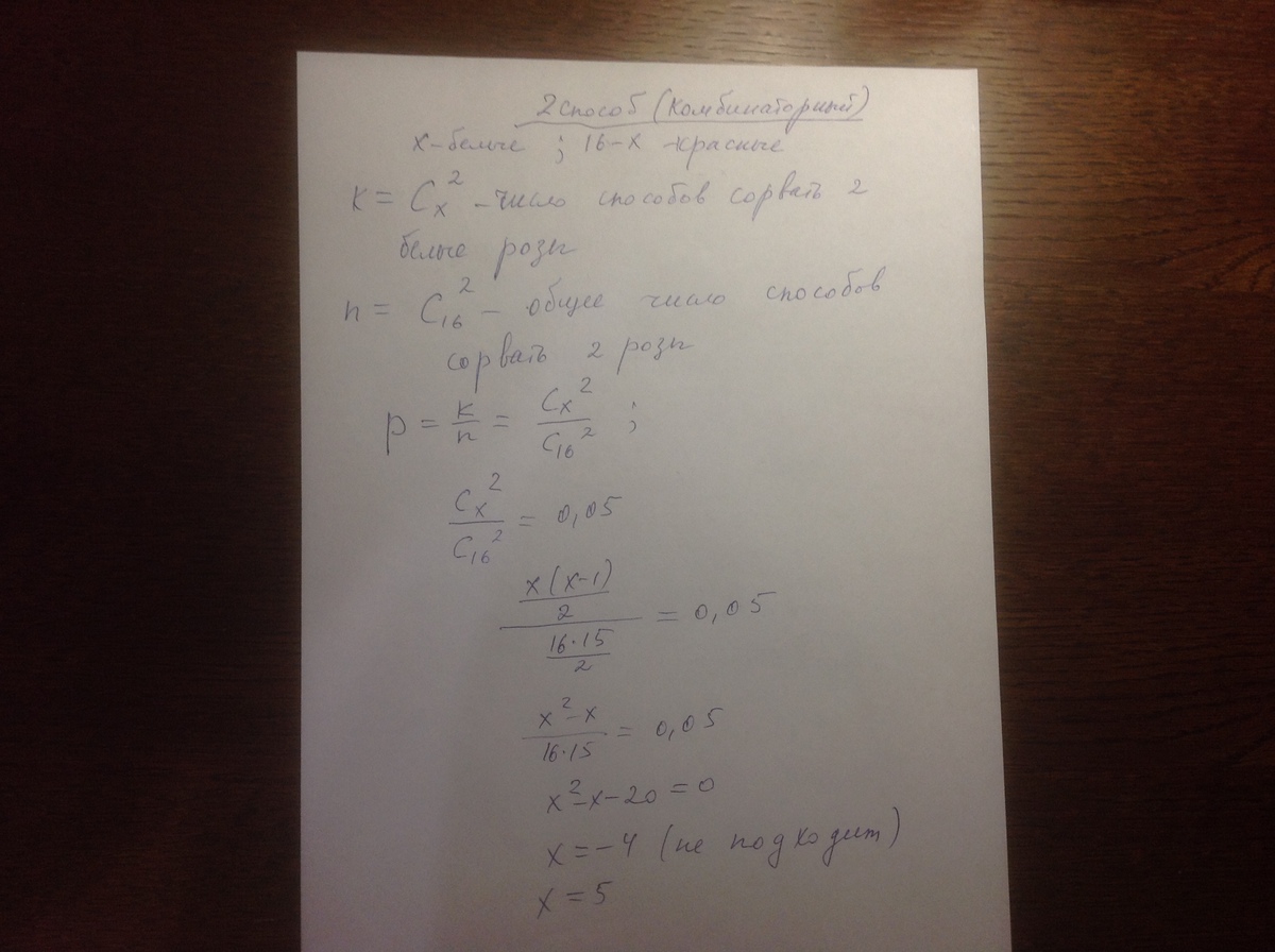 Помогите пожалуйста! На клумбе посажено 16 роз белого и красного цветов. Вероятность того, что с клумбы сорвут две розы белого цвета равна 0,05. Сколько на клумбе красных роз?