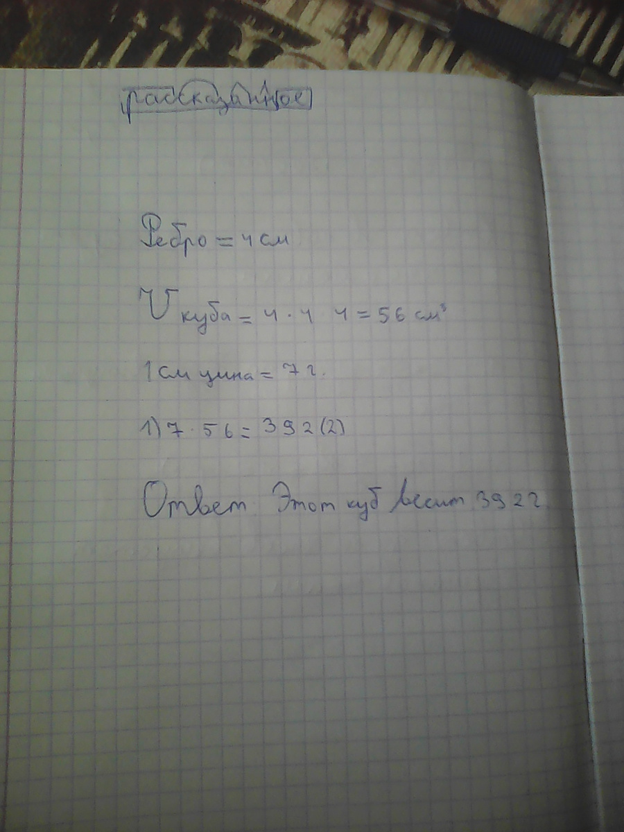 Как решить задачу Ребро куба, изготовленного из цинка, равно 4 см. Найдите массу куба,если масса 1 см3 цинка составляет 7 г. ПЛИЗ РЕШИТЕ С ПОЯСНЕНИЕМ !!!