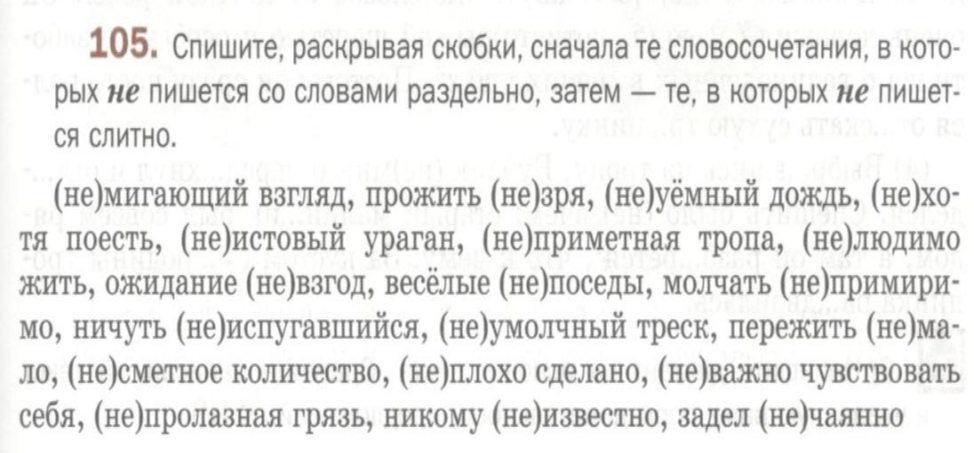 Немигающий взгляд, прожить не зря, неуемный дождь, нехотя поесть, неистовый ураган, не приметная тропа,нелюдимо жить, ожидание невзгод, веселые непоседы, молчать непримиримо, ничуть не испугавшийся, неумолчный треск, пережить не мало, несметное количество, не плохо сделано, неважно чувствовать себя, непролазная грязь, никому неизвестно, задел нечаянно