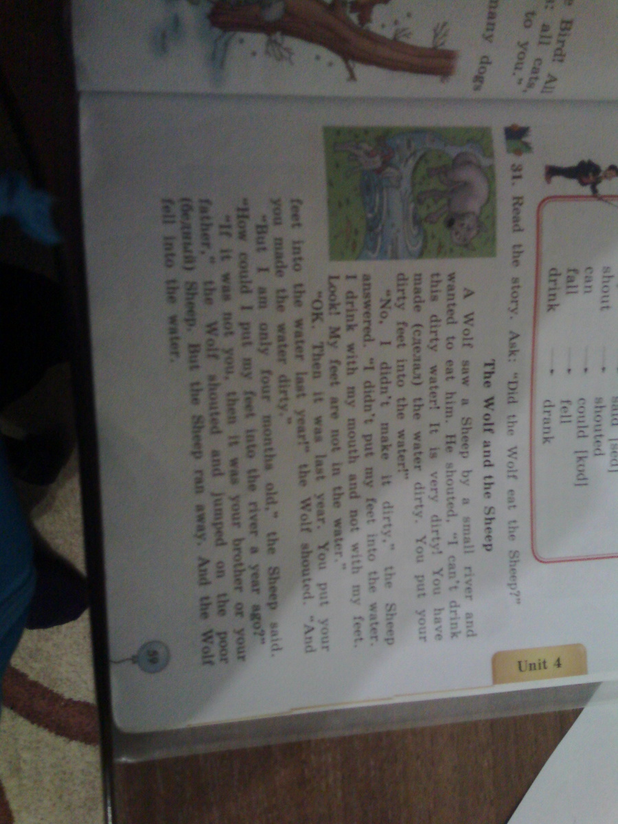 "Нет, я не делал воду грязной," - Ответил Баран. "Я не окунал свою ногу в воду. Я пил своим ртом и без своей ноги. Посмотри! Моя нога не в воде".