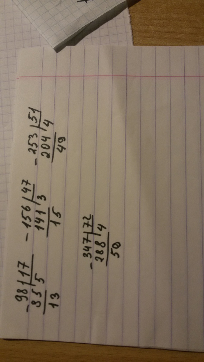 номер 36.Выполни деление столбиком для следущих пар чисел:98и17,156и47,253и51,347и72 .