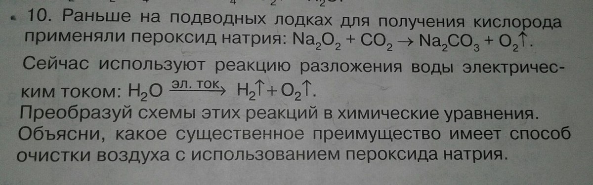 2Na₂O₂ + 2CO₂ = 2Na₂CO₃ + O₂↑ -- преимущество в использовании углекислого газа, при том выделяется такой же объём кислорода, что не меняет давление в подлодке