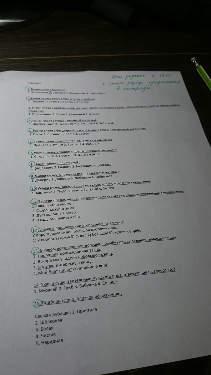 12) 1. У порога ( у чего?), 2. дома (где?), 4. большой (какой), 5. охотничий (какой)