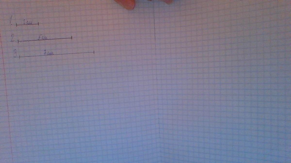 на черти три отрезка: длина первого отрезка 2см;длина второго отрезка на 3 см больше длины первого; длина третьего отрезка равна сумме длин первого и второго отрезков