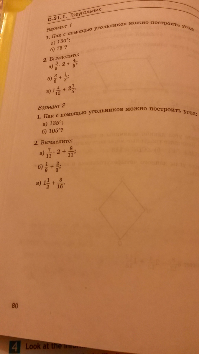 1) с помощью угольника тебе здесь никто не построит. 2) а)7/11×2+8/11=14/11+8/11=22/11=2; б)1/9+2/3=(1+6)/9=7/9; В) 1 1/2+3/16=3/2+3/16=27/16=1 11/16