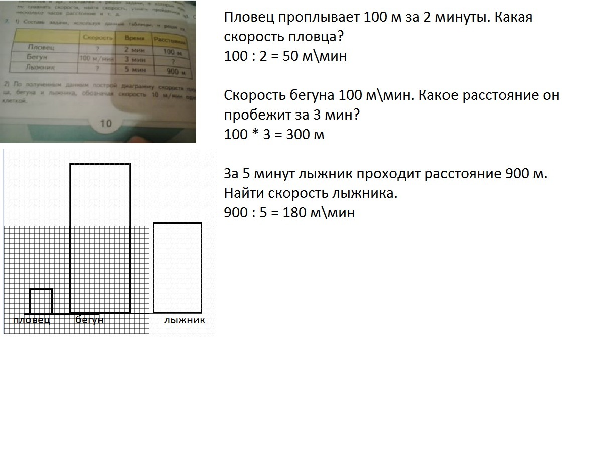 2) по полученным данным построй диаграмму скорости пловца , бегуна и лыжника , обозначая скорость 10 м /мин одной клеткой .