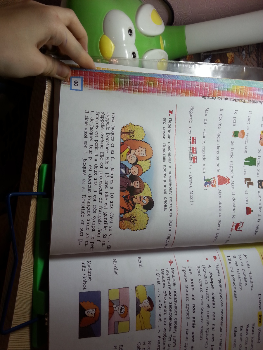 C'est Jacques et sa famille. Jacques a 10 ans. C'est sa soeur. Elle s'appelle Dorothée. Elle a 13 ans. Elle est gentille. Sa mère s'appelle Evelyne. Elle est professeur de français. Son fils François est petit. Il a deux ans. Il est très sympa, le petit frère de Jacques. Leur père est docteur. François aime sa mère. Il aime aussi son frère Jacques, sa souer Dorothée et son père.