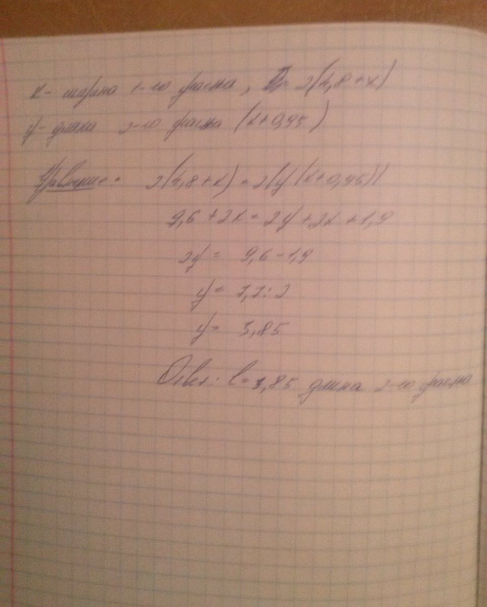 2 участка прямоугольной формы имеют одинаковый периметр. Длина первого участка 4,8м. Какова длина второго участка,если его ширина на 0,95м больше, чем ширина первого?