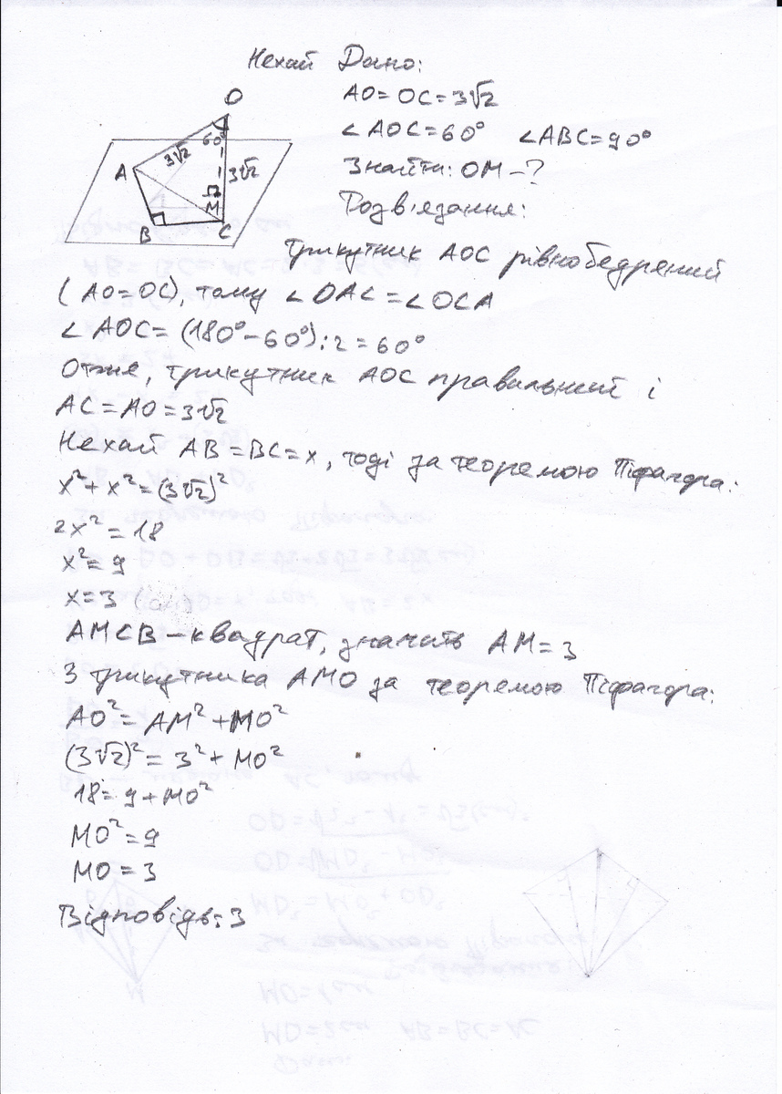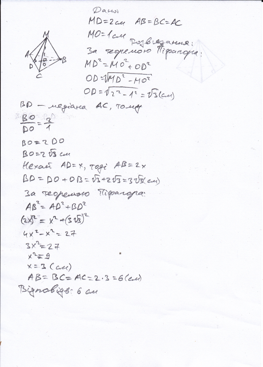 2.Точка М находится на расстоянии 2 см от каждой стороны правельно треугольника и на расстоянии 1 см от плоскости треугольника. Найти стороны треугольника.