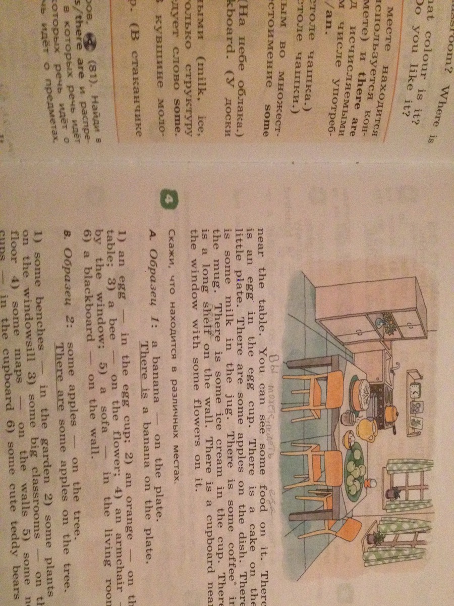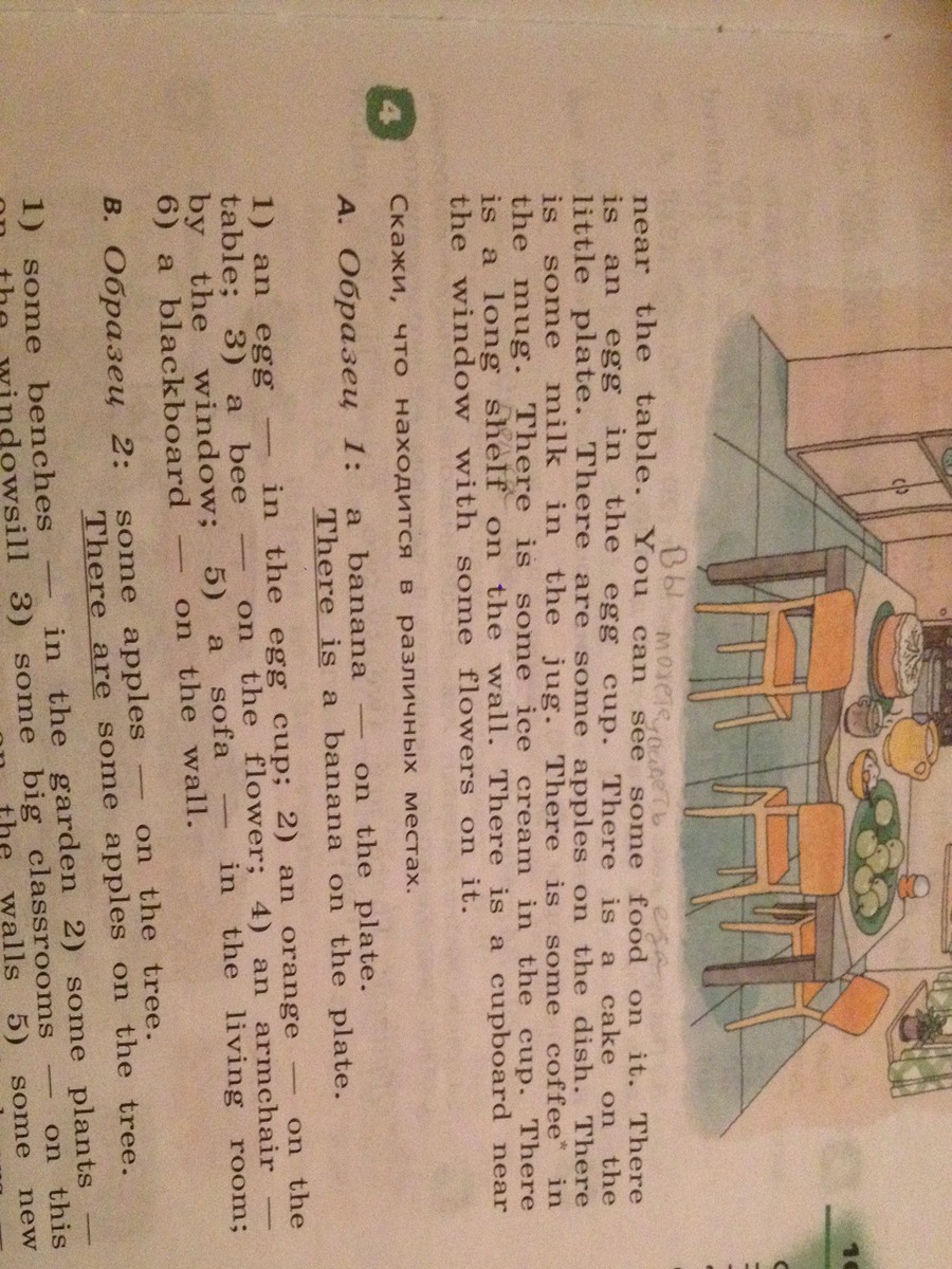около стола. Ты можешь видеть немного еды на нем.Там есть яйцо в подставке для яиц. Пирог на маленькой тарелке. Немного я блок на блюде. Немного молока в кувшине. Немного кофе в кружке. Немного мороженого в чашке .Длинная полка на стене.Буфет около окна с цветами на нем .Вроде бы все, выбери мой ответ лудшим