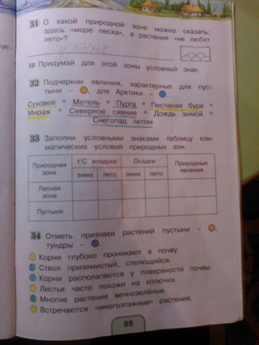 Лесная зона -12°С зимой, +26°С летом. Зимой в лесной зоне стоит ясная, сухая и морозная погода, толщина снежного покрова едва достигает 20—30 см,в пустыни снежный покров 15-20см, снег лежит 110 или 130 дней,природные явления в лесной зоне я так думаю, лесные пожары,в пустынной зоне природные явления песчанные бури бывает дождь, но он не попадает на песок а сразу испаряется