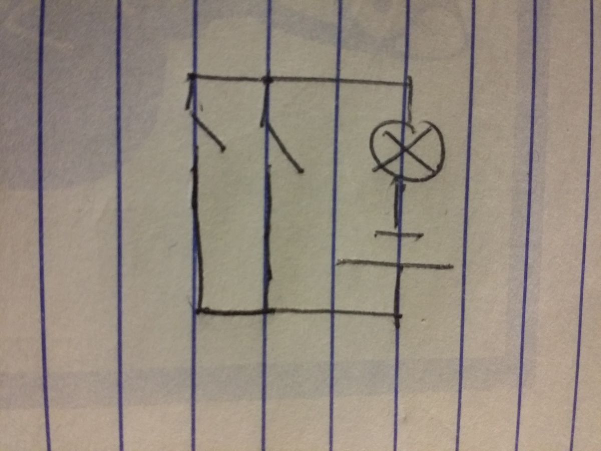 Нарисуйте схему соединения батарейки, лампочки и двух ключей, при котором для включения лампочки необходимо замкнуть хотя бы один ключ!