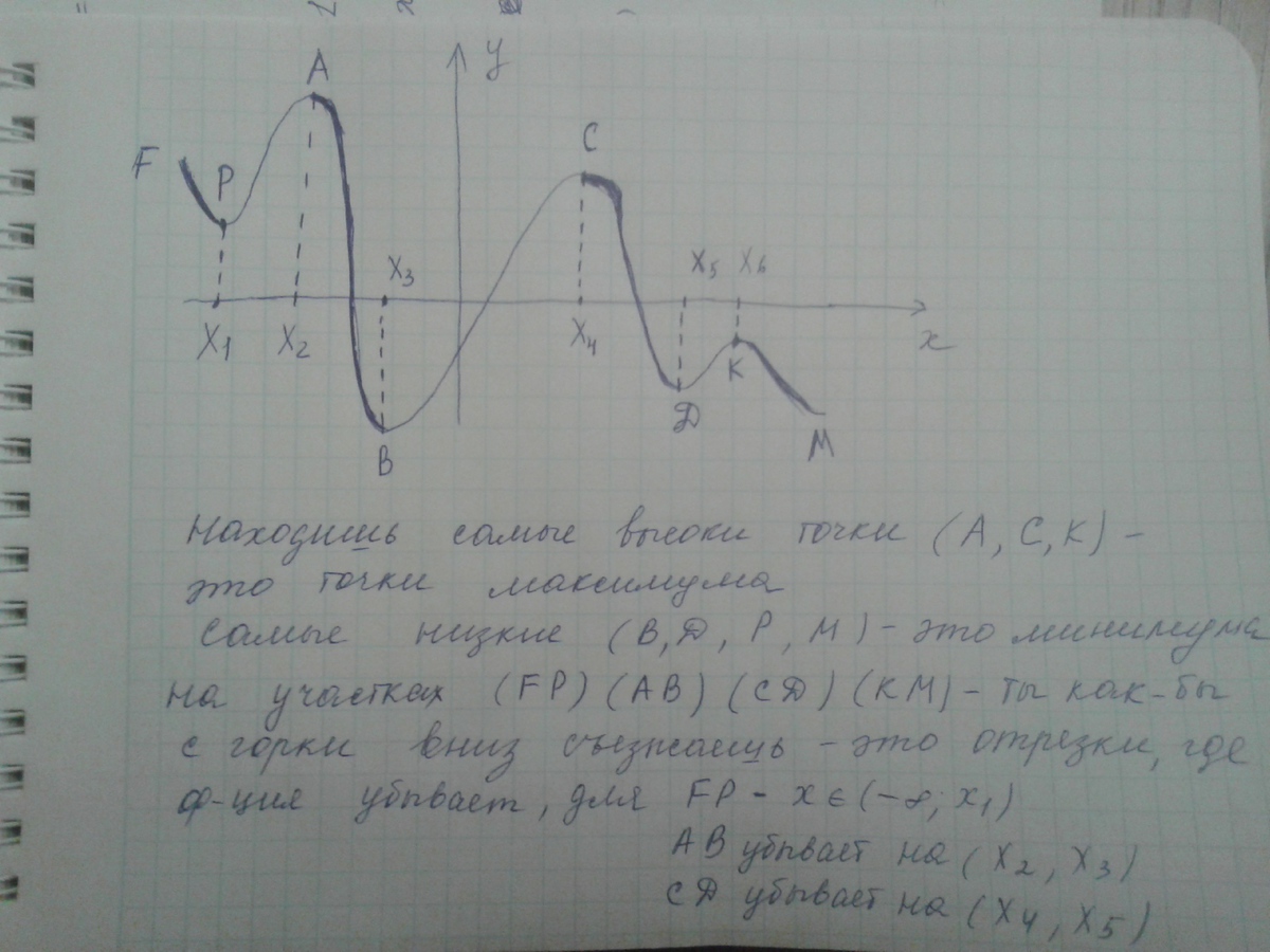 жирные участки - это функция убывает, а там где, как-бы поднимаешься по графику вверх - это участки возрастания