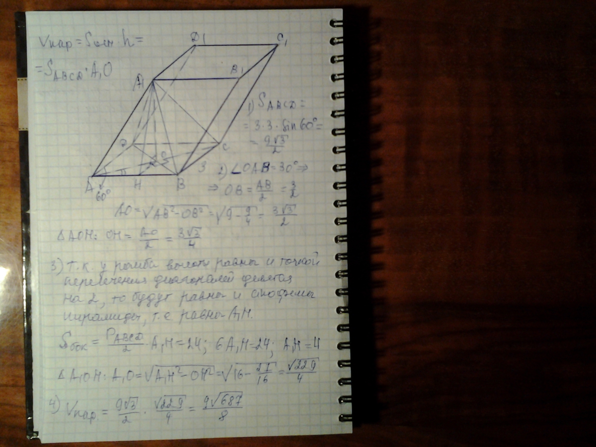 основание наклонного параллелепипеда ABCDA1b1c1d1 - ромб ABCD, у которого AB=3 см , угол BAD=60*,Ортогональная проекция вершины А1 на плоскость основания совпадает с точкой пересечения диагоналей робма ABCD.Вычислите объем параллелепипеда , если площадь боковой поверхности пирамиды A1ABCD=24см^2