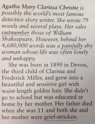Agatha Christie is the famous detective story writer. She was born in Devon,England,on September 15, 1890. She was home schooled by her mother.