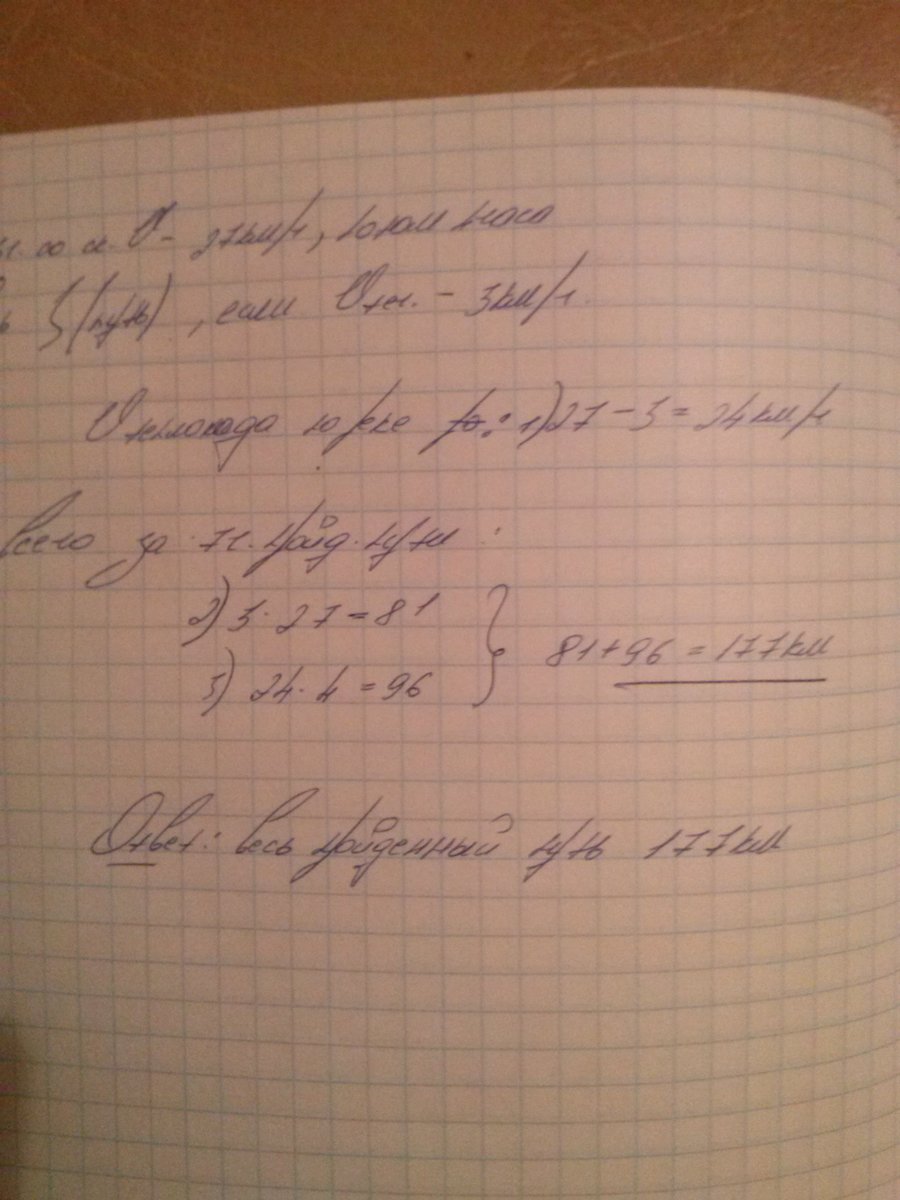 Теплоход шел по озеру 3 часа со скоростью 27 км/ч,а потом 4 часа по реке впадающая в это озеро. найдите весь путь который прошел теплоходза эти 7 часов,если скорость течения реки 3 км/ч
