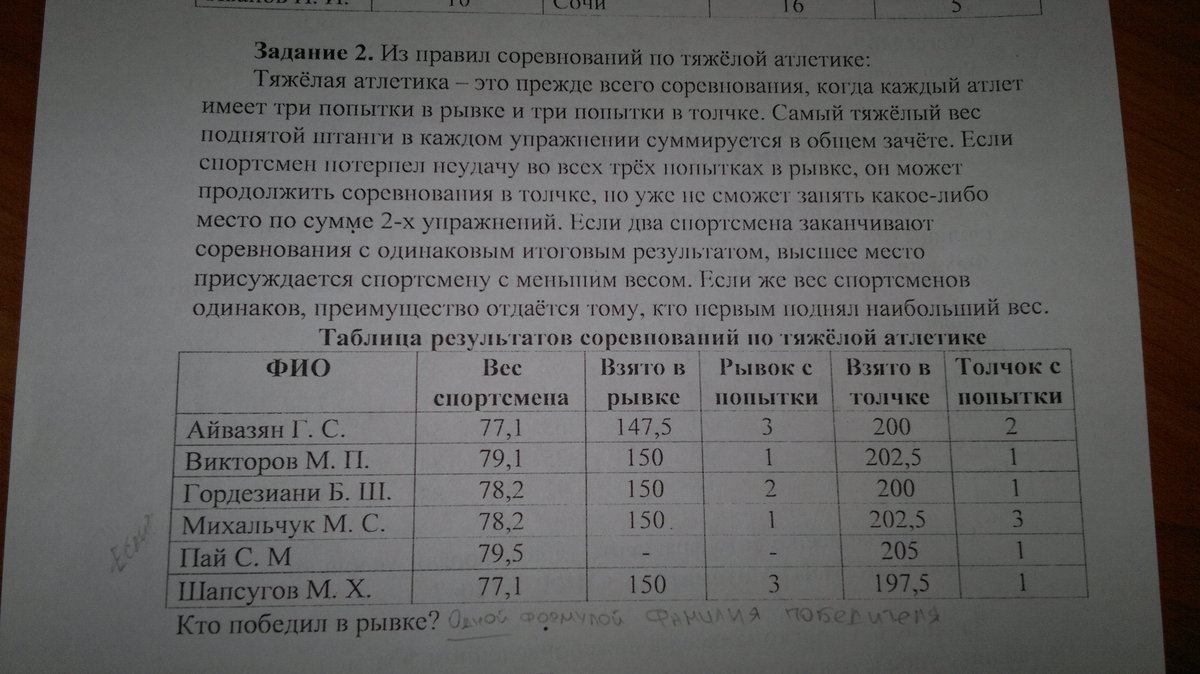 То есть нужно что бы у одного человека была самая большая сумма результатов и самый маленький вес, я так понимаю. По моим расчетам это Михальчук. Но в ответе В ЯЧЕЙКЕ должна появиться ФАМИЛИЯ. Не могу сделать( Хелп, ребят.