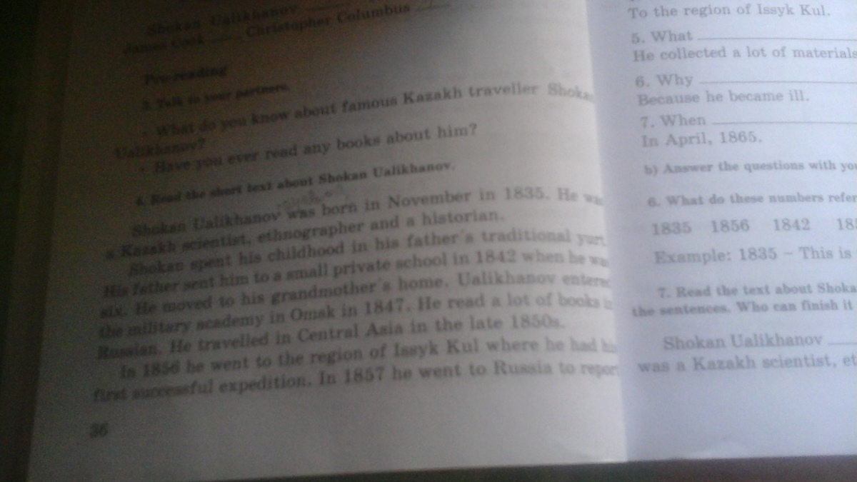 С.у. Родился в ноябре 1835г. Он был казахстанским ученым, этнографом и историком. C. Провел свое деттство в папиной традиционной юрте. Его папа отправил его в маленькую частную школу в 18.. году, когда ему было 6 лет. Он переехал к бабушке. Улиханов окончил военную академию.... Он прочитал очень много книг на русском языке. Путешествовал в централтной азии в конце 1850. В 1856 отправился в регион и. Где была его первая экспедиция