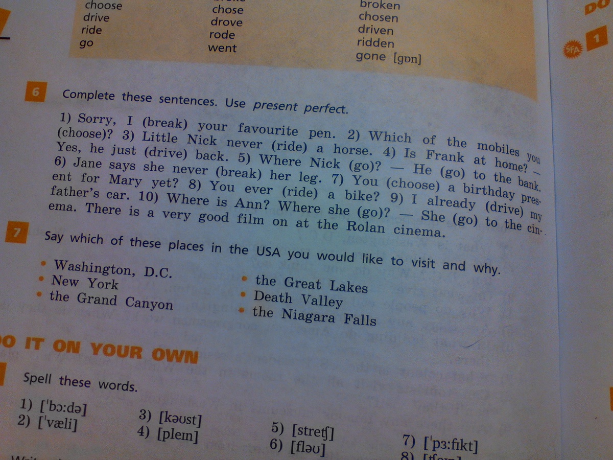 6) 6. 1)Sorry, i have broken your favorite pen. 2)Which of the mobiles you Have you chosen? 3)Little Dick Has never ridden a horse.4)Is Frank at home?-Yes, he He has just driven back.5)Where Nick gone? He has gone to the bank; .6)Jane says She has never broken her leg.7)Haven't you chosen a birthday present for Mary yet? 8)Have you ever ridden a bike?9) I have already driven my father's car.10)Where is Ann has she gone? She has gone to the cinema.There is a very good film on at the Rolan cinema.