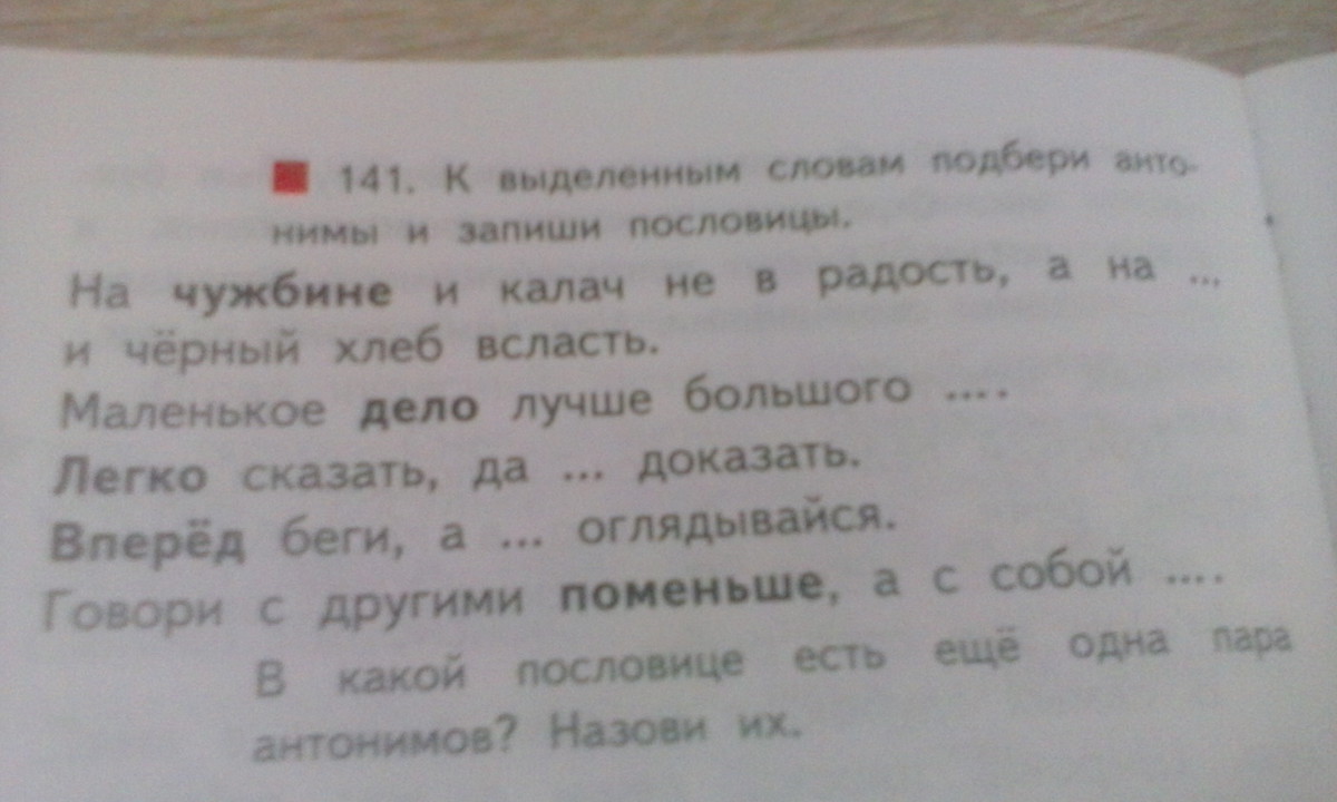 На чужбине и калач не в радость, а на родине и черный хлеб всласть. Маленькое дело лучше большого безделья. Легко сказать, да трудно доказать. Вперед беги, а назад оглядывайся. Говори с другими поменьше, а c собой побольше.