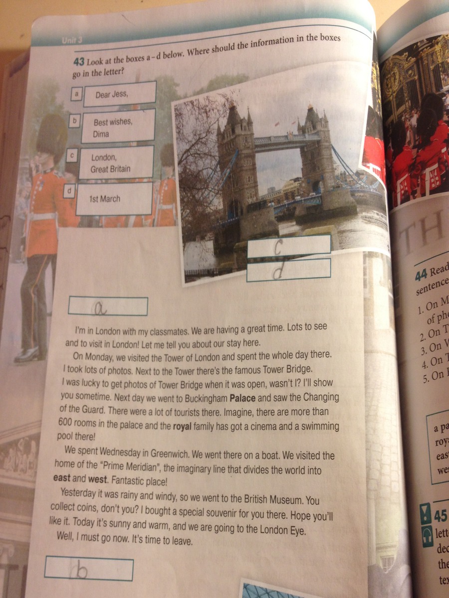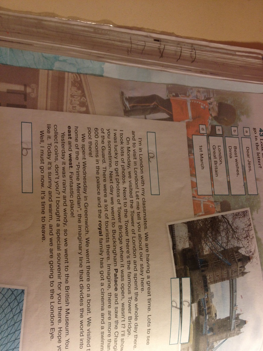 В понедельник мы посетили Лондонский Тауэр и провели там целый день. Я сделал множество фотографий. Рядом с Тауэром находится знаменитый Тауэрский мост. Мне очень повезло, что я успела сделать несколько снимков, пока мост был открыт, не так ли? Я как-нибудь покажу тебе. На следующий день мы пошли в Букингемский дворец и наблюдали смену караула. Там было много туристов. Представь себе, во дворце находится более 600 комнат вместе с кинотеатром и бассейном, принадлежащими королевской семье.