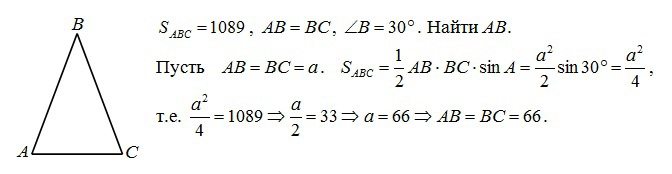 угол при вершине,противолежащей основанию равнобедренного треугольника,равен 30 градусов.найдите боковую сторону треугольника,если его площадь 1089