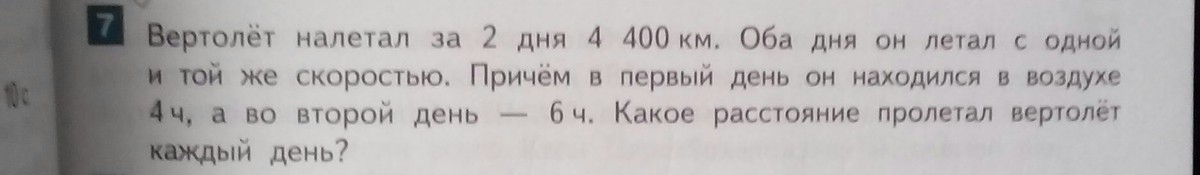 Господи, он летал в общем 6+4-10 часов, значит смотрим сколько он пролетал за 1 час, 4 400/10=440км, то есть в первый день он пролетел 1760 км, во второй 4400-1760=2640