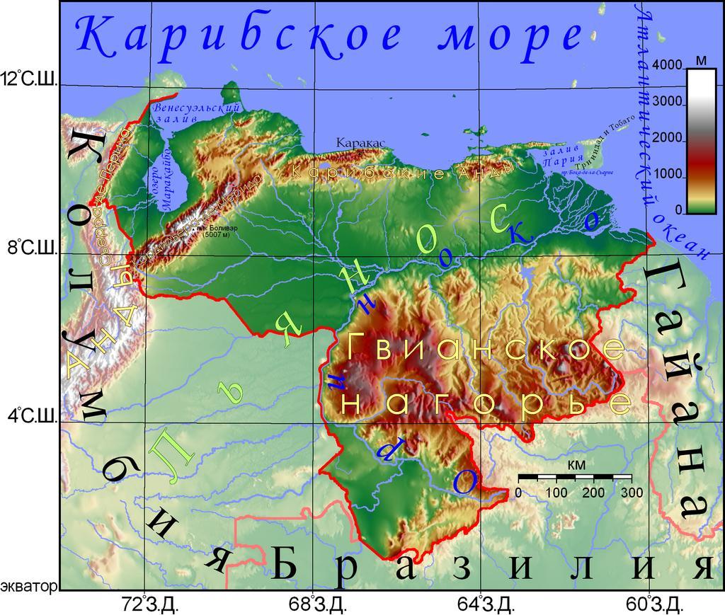 Если посмотреть на физическую карту страны, которая дана ниже в приложении, то на ней очень хорошо виден разнообразный рельеф.На северо-западе проходят горы Анды, которые сильно расчленены, а между ними лежит низменность с озером Маракайбо.К югу от Анд расположены большие равнины (льянос).А всю центральную, южную и юго-восточную область занимает Гвианское нагорье.Самая высокая точка страны-это пик Боливар (5007 м) на северо-западе страны, а самая низкая-побережье Карибского моря (0 м).