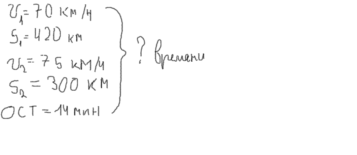 Поезд прошел без остановок 420 км со скоростью 70 км/ч,затем он сделал остановку на 14 мин, а остальные 300 км прошел со скоростью 75 км/ч сколько времени было затрачено на весь путь? ПОМОГИТЕ ПОЖАЛУЙСТА + НЕЗНАЮ КАК КРАТКУЮ ЗАПИСЬ ВЕСТИ ПРОГРАМА ФГОСТ