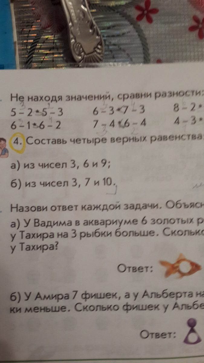 б).3+7=10; 10-7=3; 10-3=7; 7+3=10