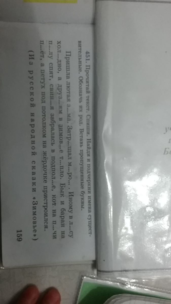 Пришла лютая зима(сущ.,женский род), затрещал мороз(сущ., м.р.). Иному в лесу(сущ., м.р.) холодно, а друзьям(сущ. мн.ч.) в зимовье(сущ., ср.р) тепло.Бык(сущ., м.р.) и баран(сущ., м.р.) на полу(сущ., м.р.) спят, свинья(сущ., ж.р.) забралась в подполье(сущ., ср.р.), кот(сущ., м.р.) на печи(сущ., ж.р.) песни(сущ, мн.ч.) поет, а петух(сущ., м.р.) под потолком(сущ., м.р.) на жердочке(сущ., ж.р.) пристроился.