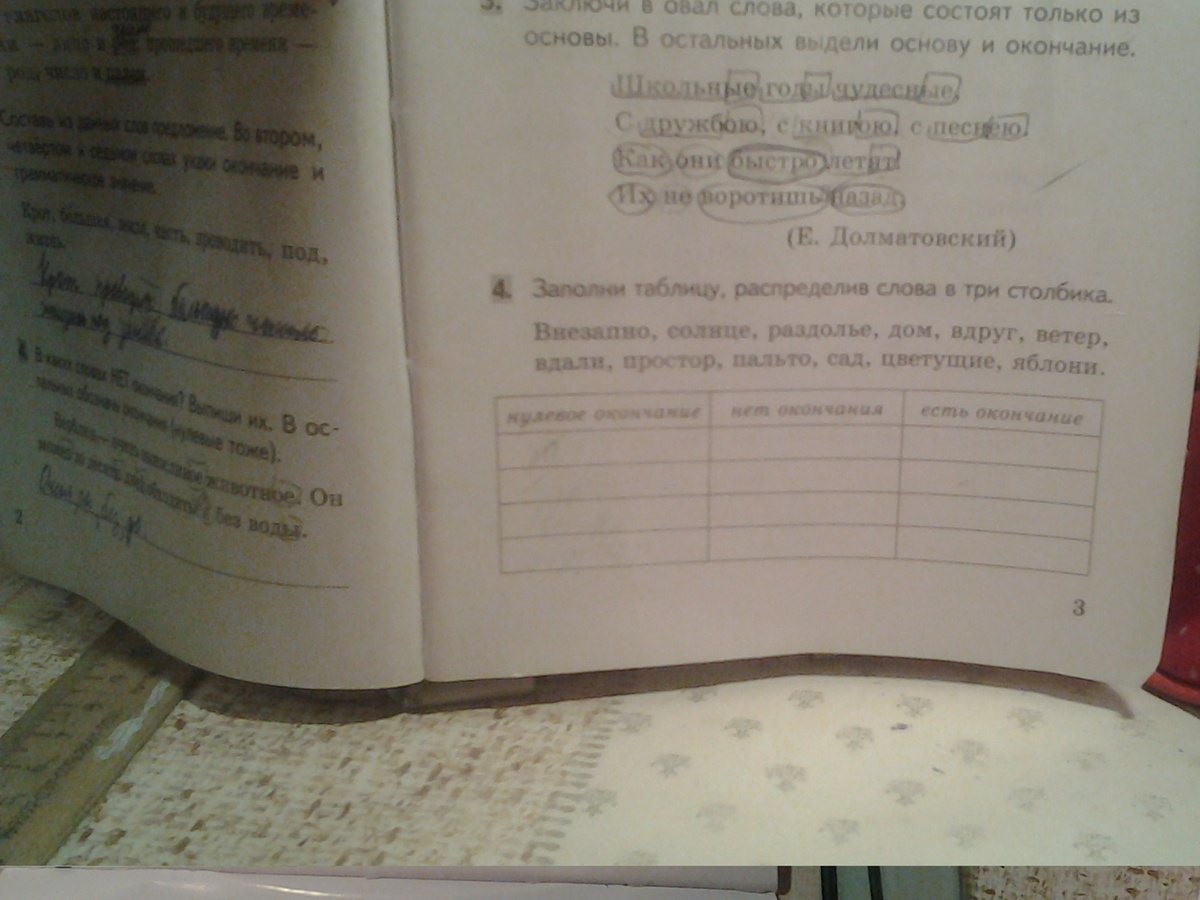 первый столбик нулевое окончание , второй столбик нет окончание , третий столбик есть окончание (номер3)