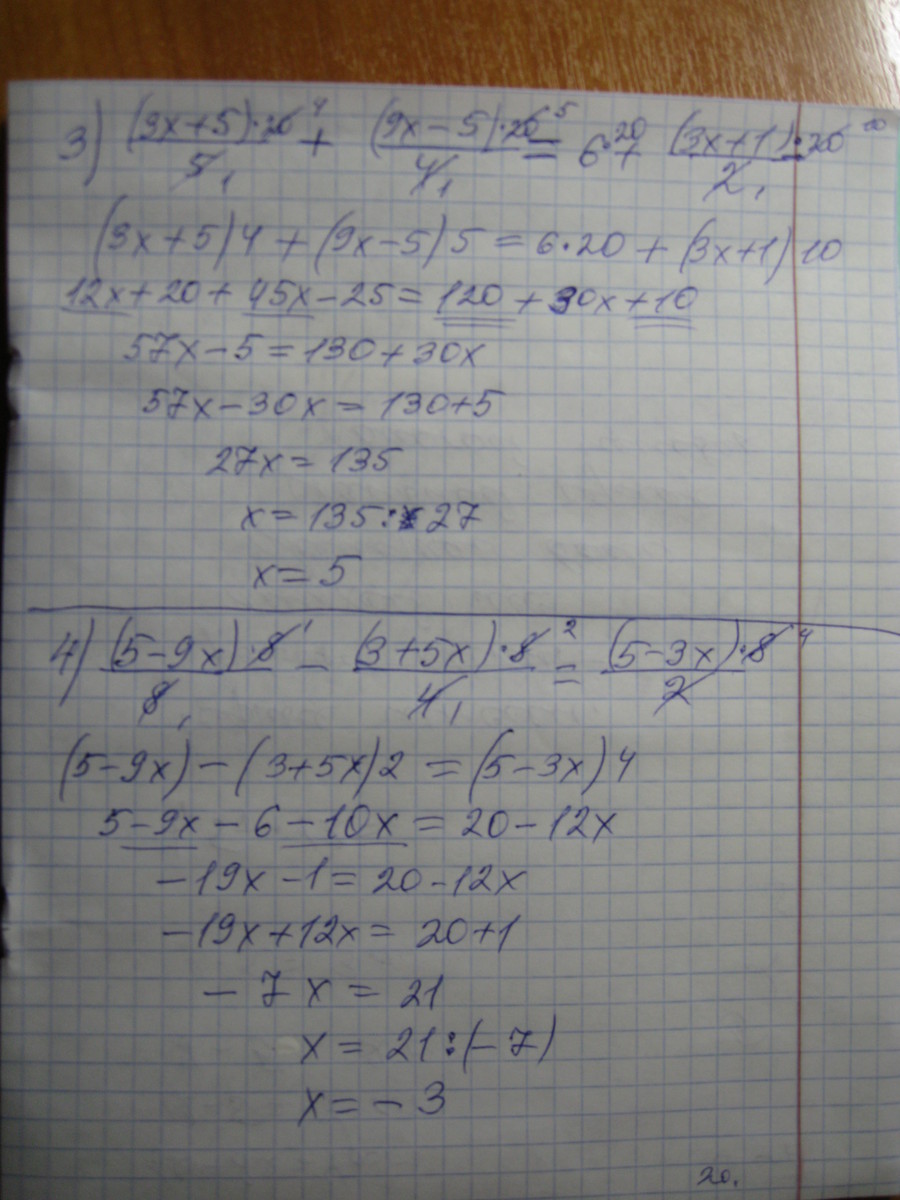 задание 3 - для начала нам надо избавиться от знаменателей: для этого мы обе части уравнения умножаем на 20 , После этого сокращаем знаменатели с числом 20 и получается СМОТри Лист..