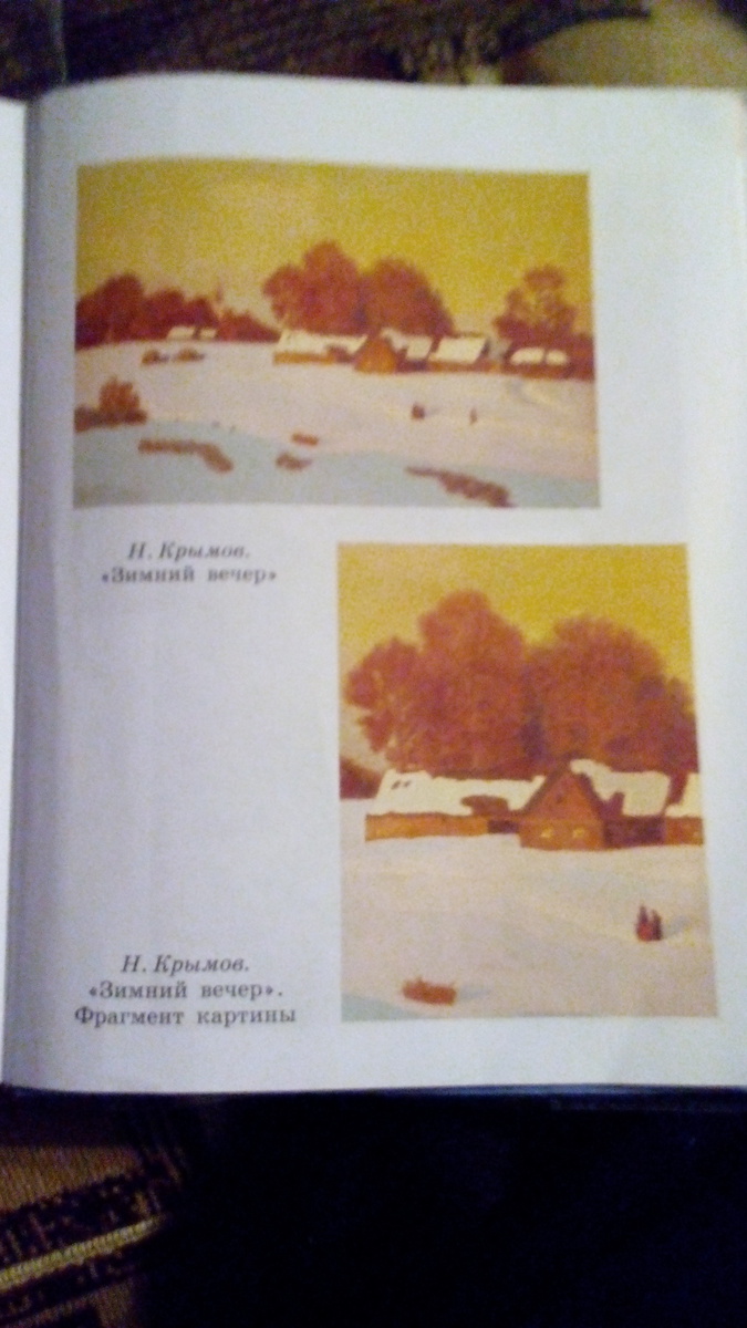 Я смотрю на картину «Зимний вечер», которую нарисовал известный художник-пейзажист Н. П. Крымов. На ней изображена деревня в зимних красках. Глядя на эту картину возникает чувство спокойствия и умиротворения. Кажется что, не смотря на огромное количество снега, этот зимний вечер теплый и солнечный. На первый план картины, художник вынес замерзшую реку, чистую и прозрачную, потому что лед изображен на ней гладким. У берега из подо-льда можно разглядеть темные пятна, их еще называют островками мелководья. А у самого берега мы видим растущий кустарник. Несколько птичек уселись на кромке льда и на самом кусте. Мне кажется что художник, рисуя свой пейзаж, находился на противоположном берегу, возможно, даже на пригорке. На втором плане деревенские избы, а за ними и растущий лес. Можно предположить, что в лесу растут дубы и тополя. Лес художник выделил, создав контраст светлого желтоватого неба, и темных домов. Перед домами раскинулись просторы со снежными сугробами, но снег не кажется тяжелым. Наоборот он кажется легким и воздушным, потому что художник изобразил его голубым цветом. В окне одной из изб, можно разглядеть мерцающий свет, немного левее можно увидеть купола колокольни. У одного из домов стоят два воза наверно с сеном, по узкой тропинке двигаются жители этого села. Для изображения снега автор пользуется разными оттенками и белого и нежно голубого цветов. Я думаю, художник хотел в своей картине передать нам настроение деревенской атмосферы. Глядя на произведение у меня возникает чувство покоя и умиротворения. Хочется стать одним из тех жителей, которые идут по тропинке. Вдохнуть морозного воздуха и окунуться в атмосферу деревенской жизни. Спасибо Крымову, за то, что подарил несколько минут фантастического путешествия, в мир фантазий