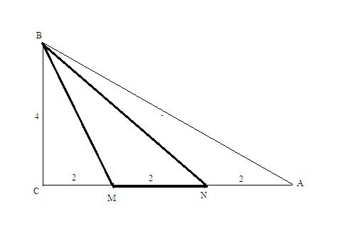 длины катетов прямоугольного треугольника АВС равны 6см и 4см. Больший катет АС разделен точками М и N на 3 равны части. точки М и N соединены вершиной В. найди площадь треугольника ВМN.