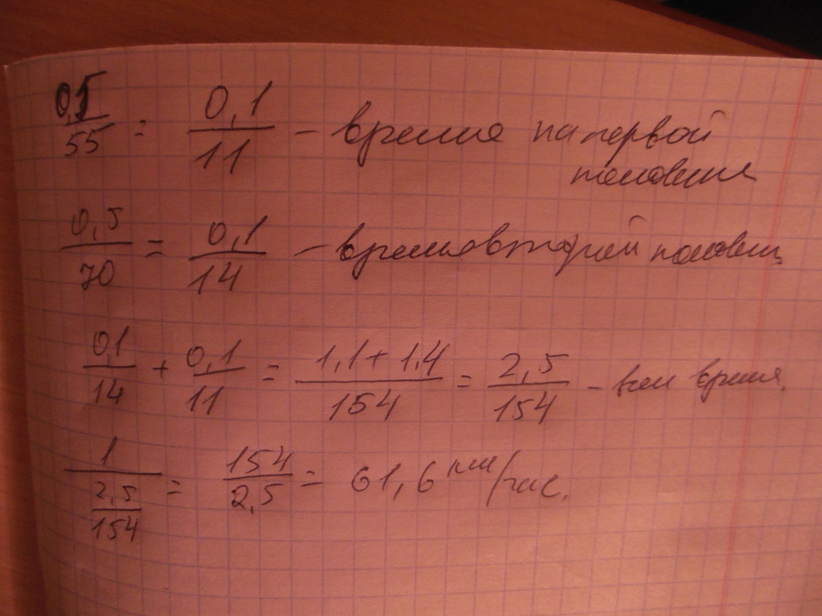 Помогите пожалуйста : Первую половину трассы автомобиль проехал со скоростью 55 км/ч, а вторую — со скоростью 70 км/ч. Найдите среднюю скорость автомобиля на протяжении всего пути.(ЭТО НЕ СРЕДНЕЕ АРИФМЕТИЧЕСКОЕ!)