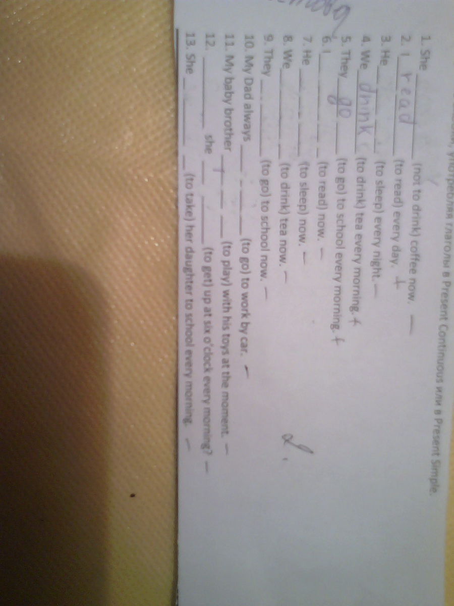 1isn't drinking 2read 3sleeps 4drink 5go 6am reading 7is sleeping 8are drinking 9are going 10goes 11is playing 12does she get 13takes