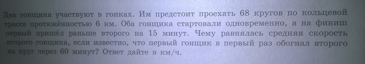 Первый обогнал второго на 6 км за час, это значит, что скорость удаления (сближения) гонщиков равна км/ч.