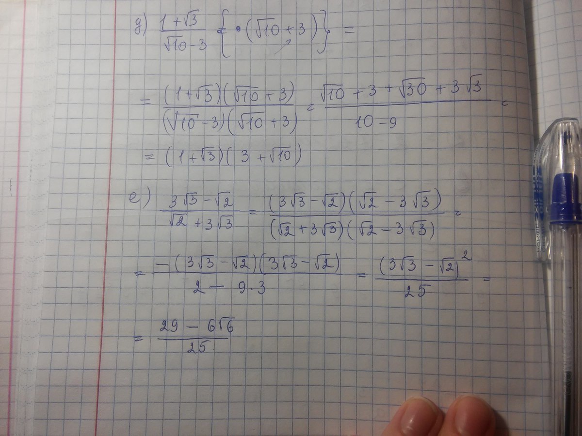 Чтобы освободиться от иррациональности в знаменателе, нужно домножить числитель и знаменатель соответствующей дроби на величину, сопряженную знаменателю (то есть на такую, где другой знак перед вторым слагаемым). Тогда в знаменателе получится формула - разность квадратов.
