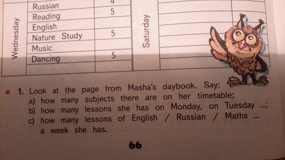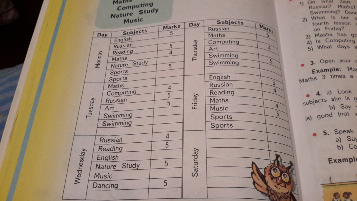 3) Английский 3 урока,русский 5 уроков,чтение 3 урока,математика 4 урока,биология 2 урока,физ-ра 4 урока,информатика (computing ) 2 урока,творчество 2 урока,плавание 4 урока,музыка 2 урока,танцы 1 урок.