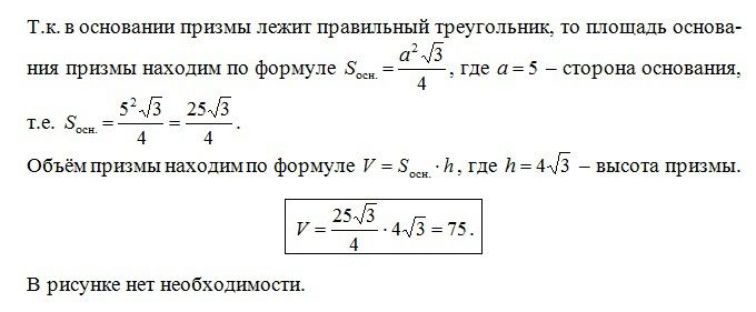 Найти обьем призмы если известно что в основании лежит правельный треугольник имеет сторону 5 высота призмы 4√3