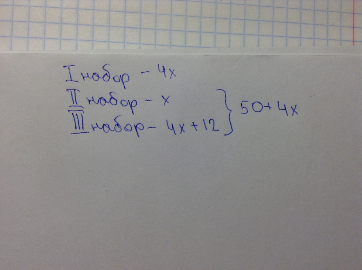 Ваня купил 3 набора марок.В первом наборе в 4 раза больше марок,чем во втором,а в третьем на 12 марок больше,чем в первом.Если к первому набору добавить ещё 50 марок,то количество марок в нем будет равно количеству марок во втором и третьем наборах вместе.Сколько марок было в каждом из купленных наборов?