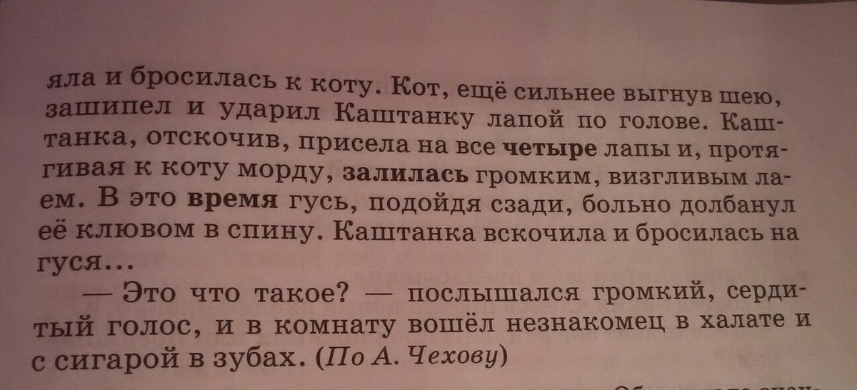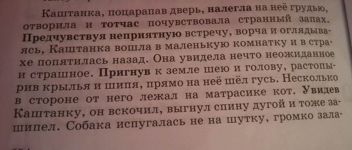 предчувствуя неприятную встречу; пригнув к земле шею и голову; растопырив крылья; увидев Каштанку; ещё сильнее выгнув шею; протягивая к коту морду; подойдя с зади