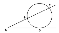 Если из одной точки проведены к окружности касательная (AD) и секущая (AC), то произведение всей секущей на её внешнюю часть (AB) равно квадрату касательной.