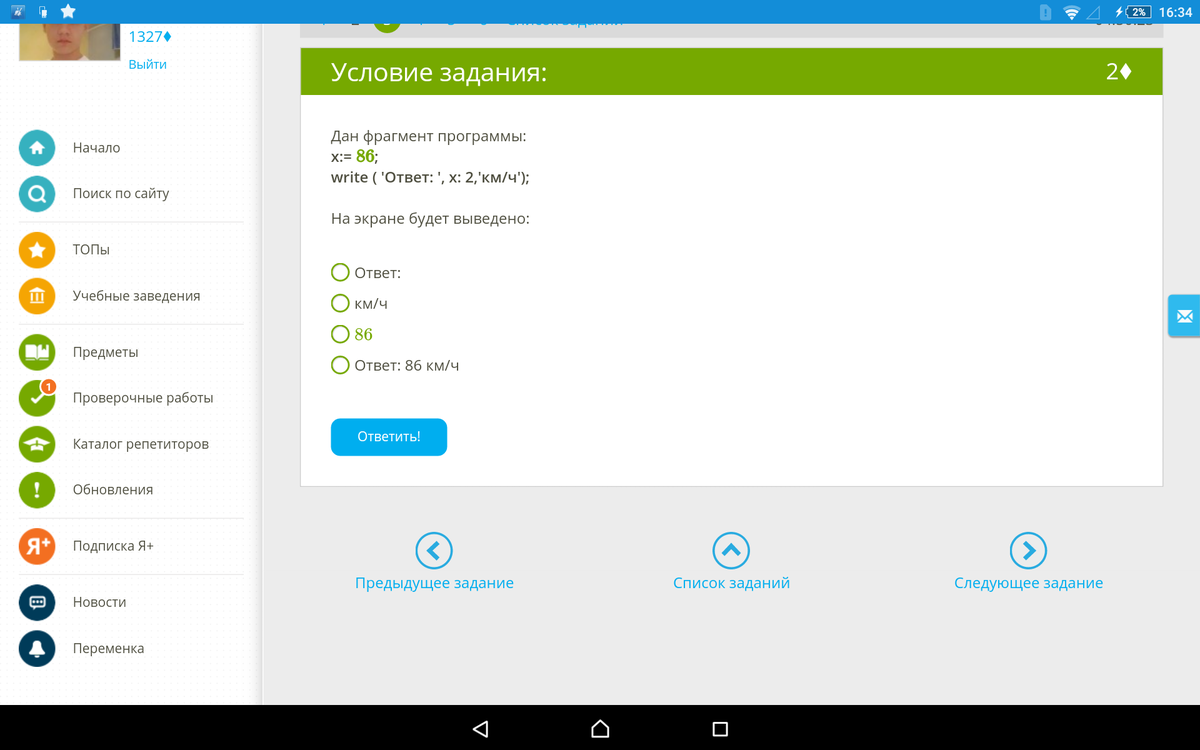 Otvet:86 km/4 Horpshosho
